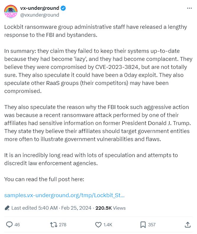 LockBit released a statement stating that law enforcement had hacked their dark web site using a vulnerability in the PHP programming language, which is widely used to build websites and online applications.